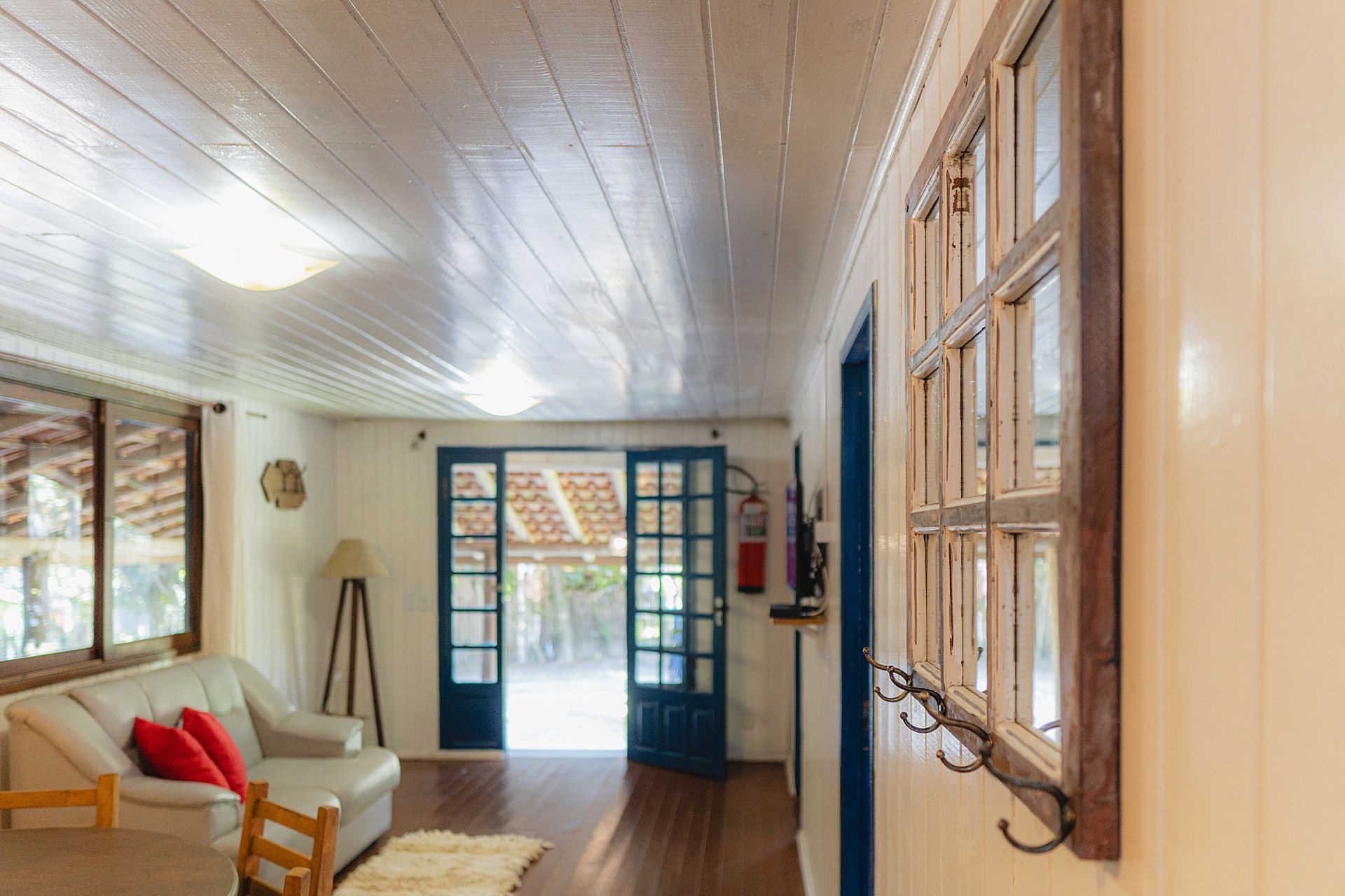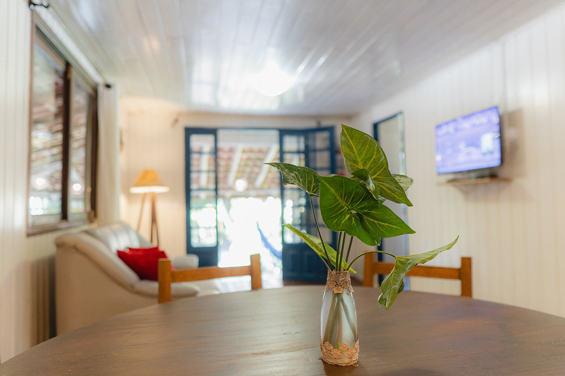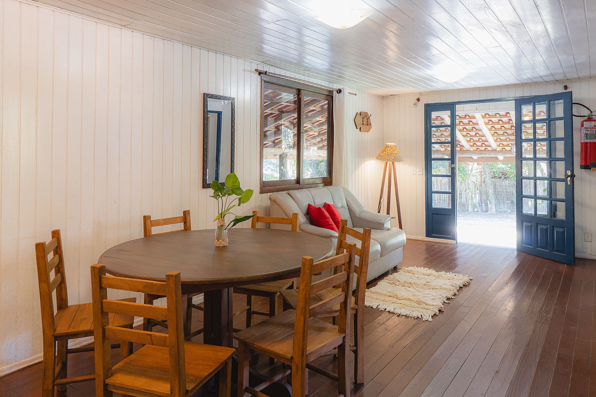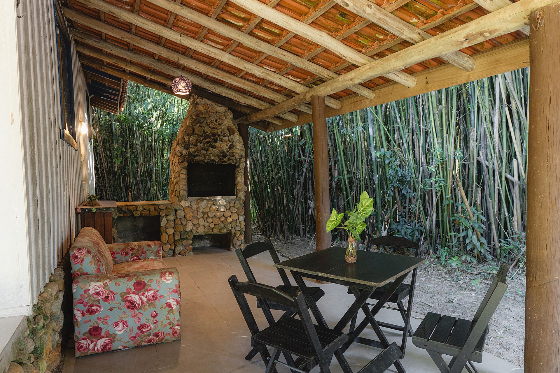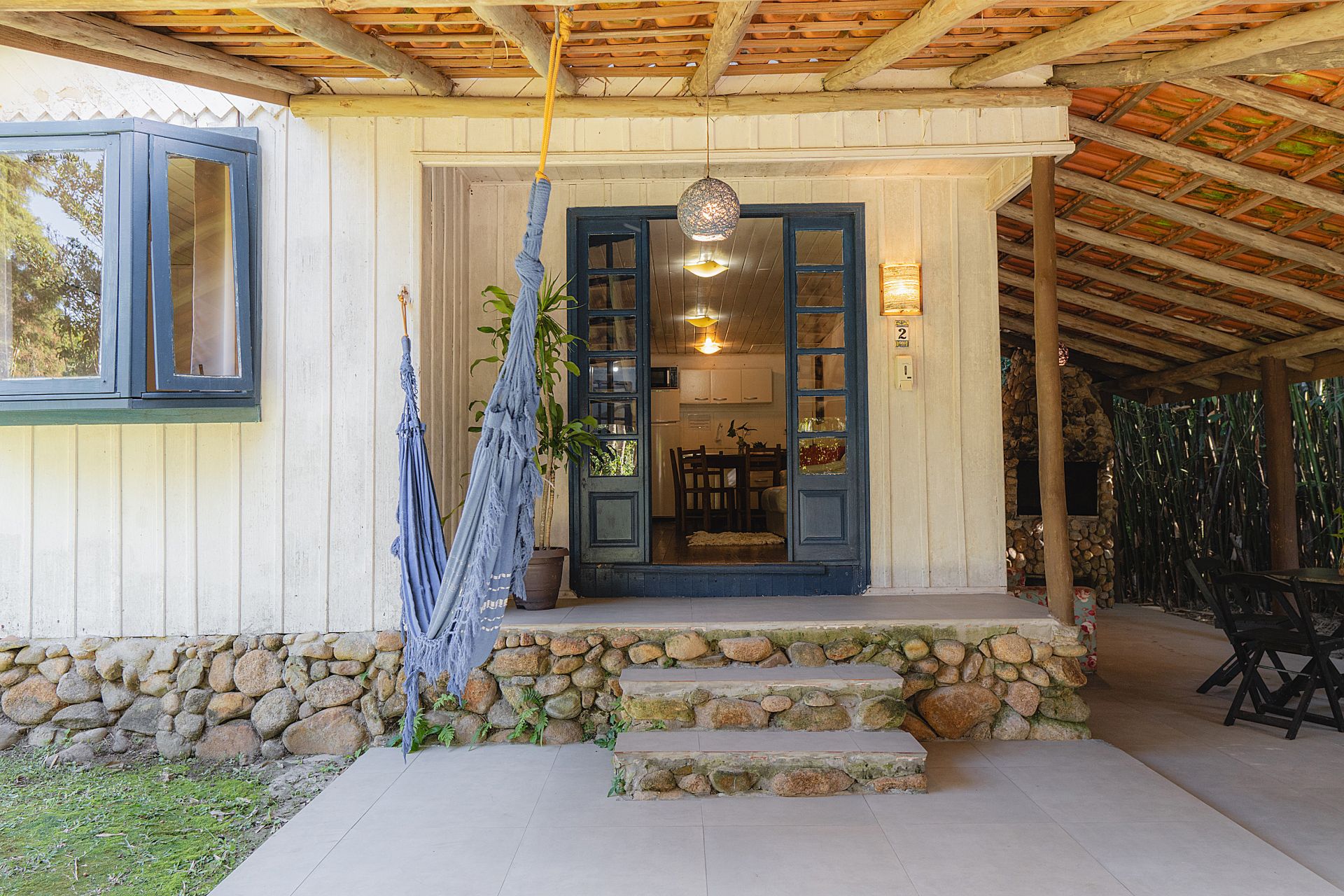 - Área externa coberta com mesa, cadeiras, sofá, rede de descanso e churrasqueira
